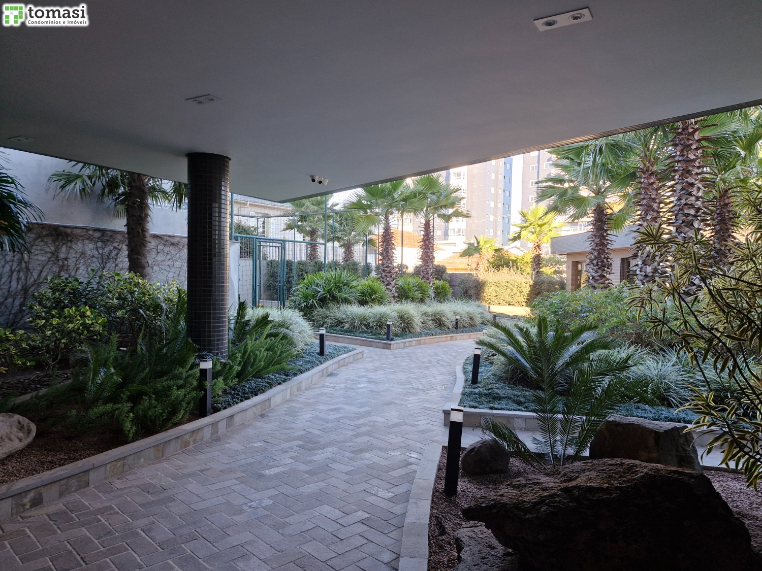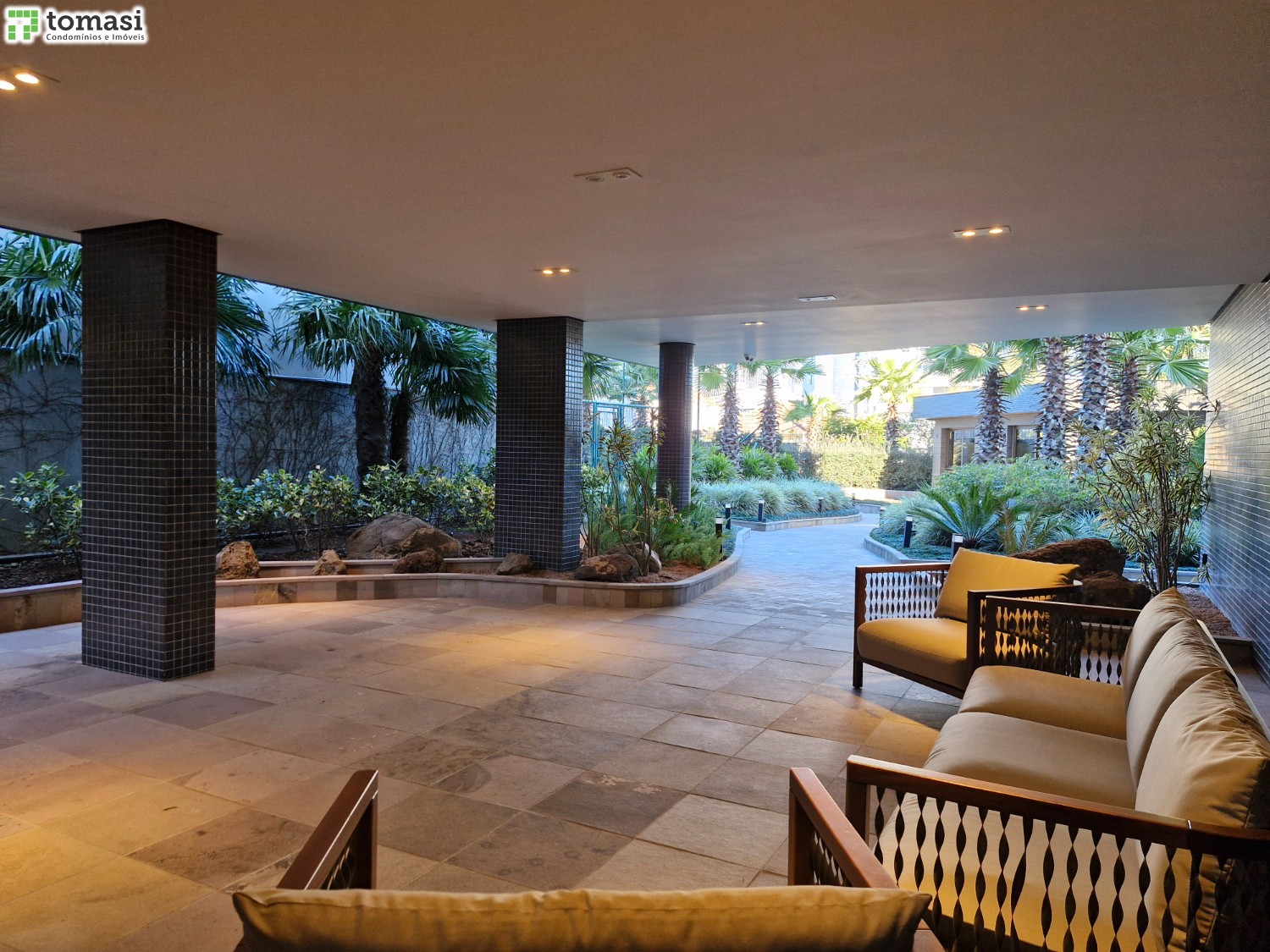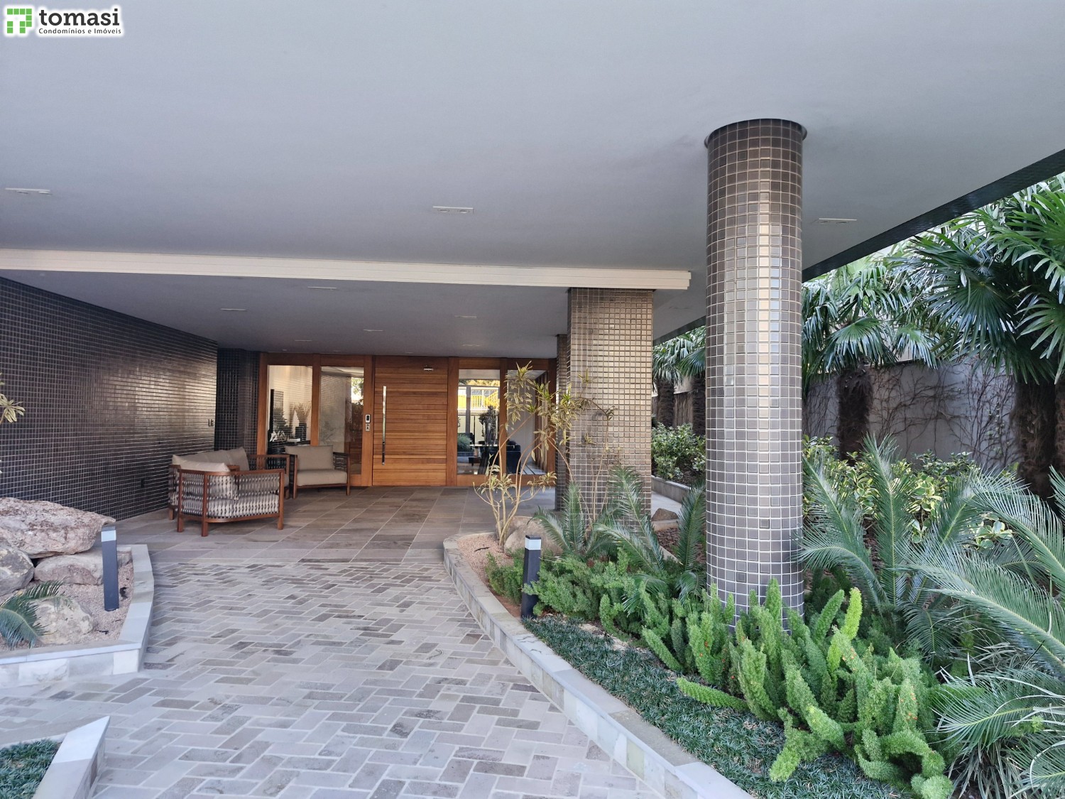 Hall de entrada externo com paisagismo que conecta com a natureza.