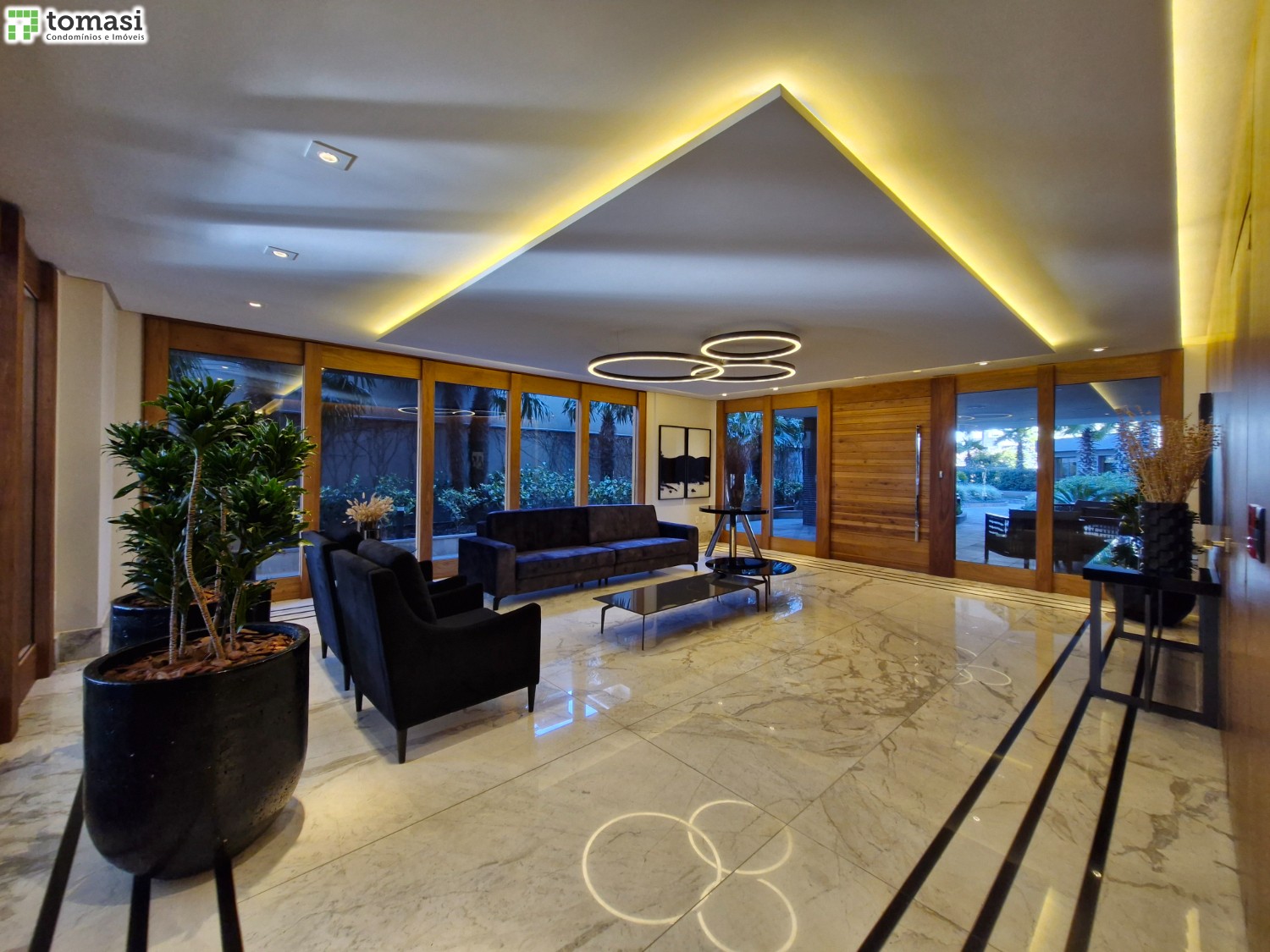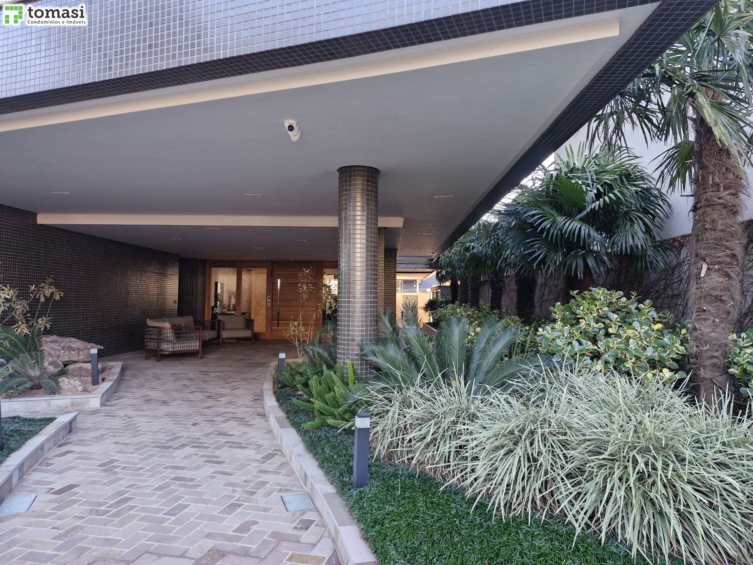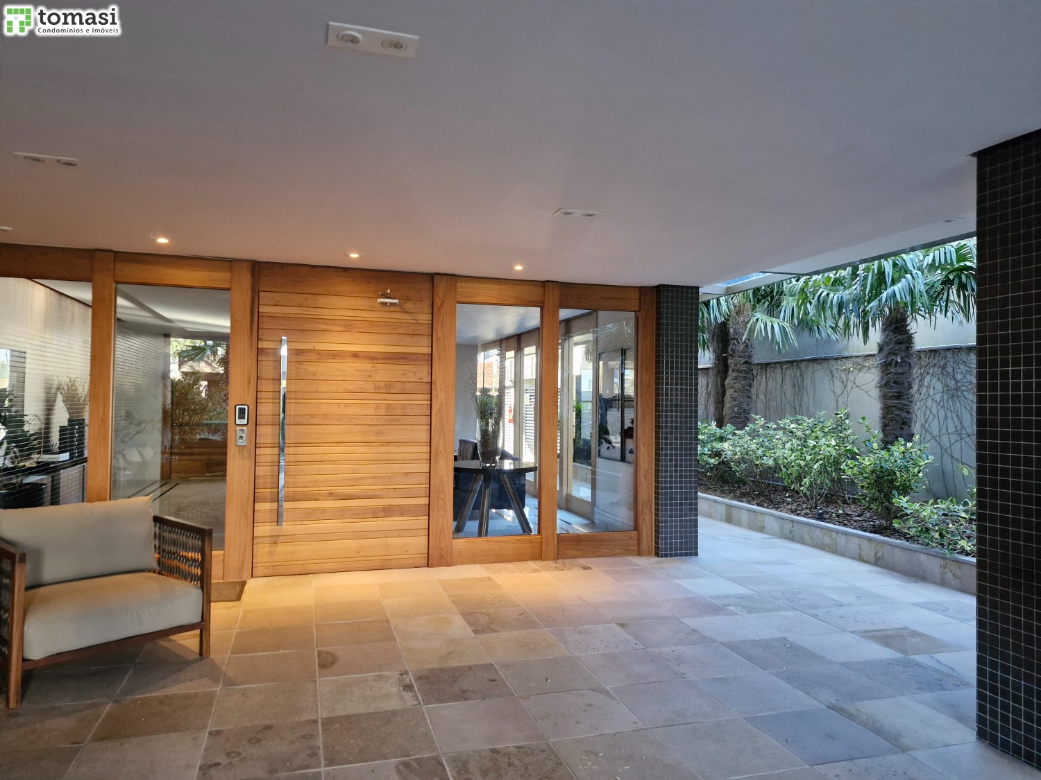 Hall de entrada externo com paisagismo que conecta com a natureza.