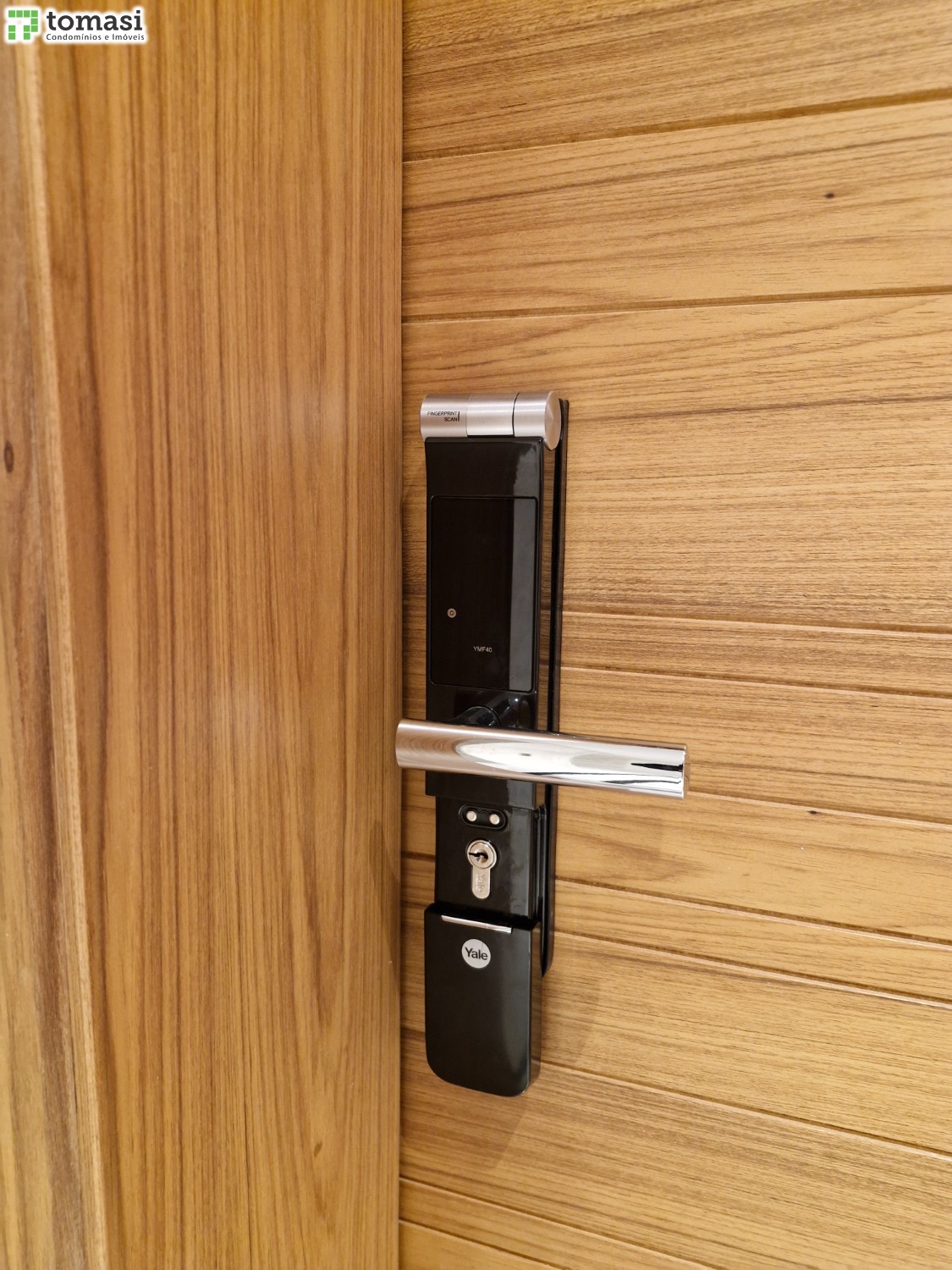 Entrada no condomínio com biometria e fechadura digital com senha nos apartamentos.