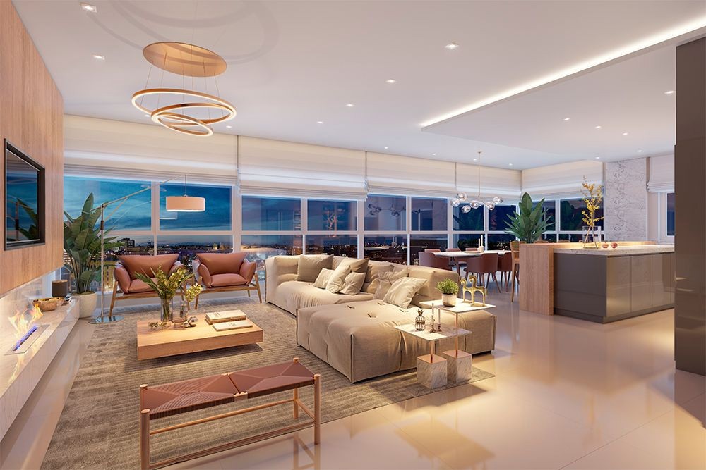 Apartamentos com 3 suítes, lavabo, garagem fechada, interfone, jantar e estar integrados, , ponto gás bifeteira, vidro duplo, água quente espera, calefação espera, churrasqueira, espera para Lareira, hall de entrada, isolamento acústico, massa corrida, rebaixe em gesso, Rede / Internet, split espera, vista panorâmica, sacada integrada, medidores individuais, piso porcelanato, piso laminado, área de serviço separada, portão eletrônico