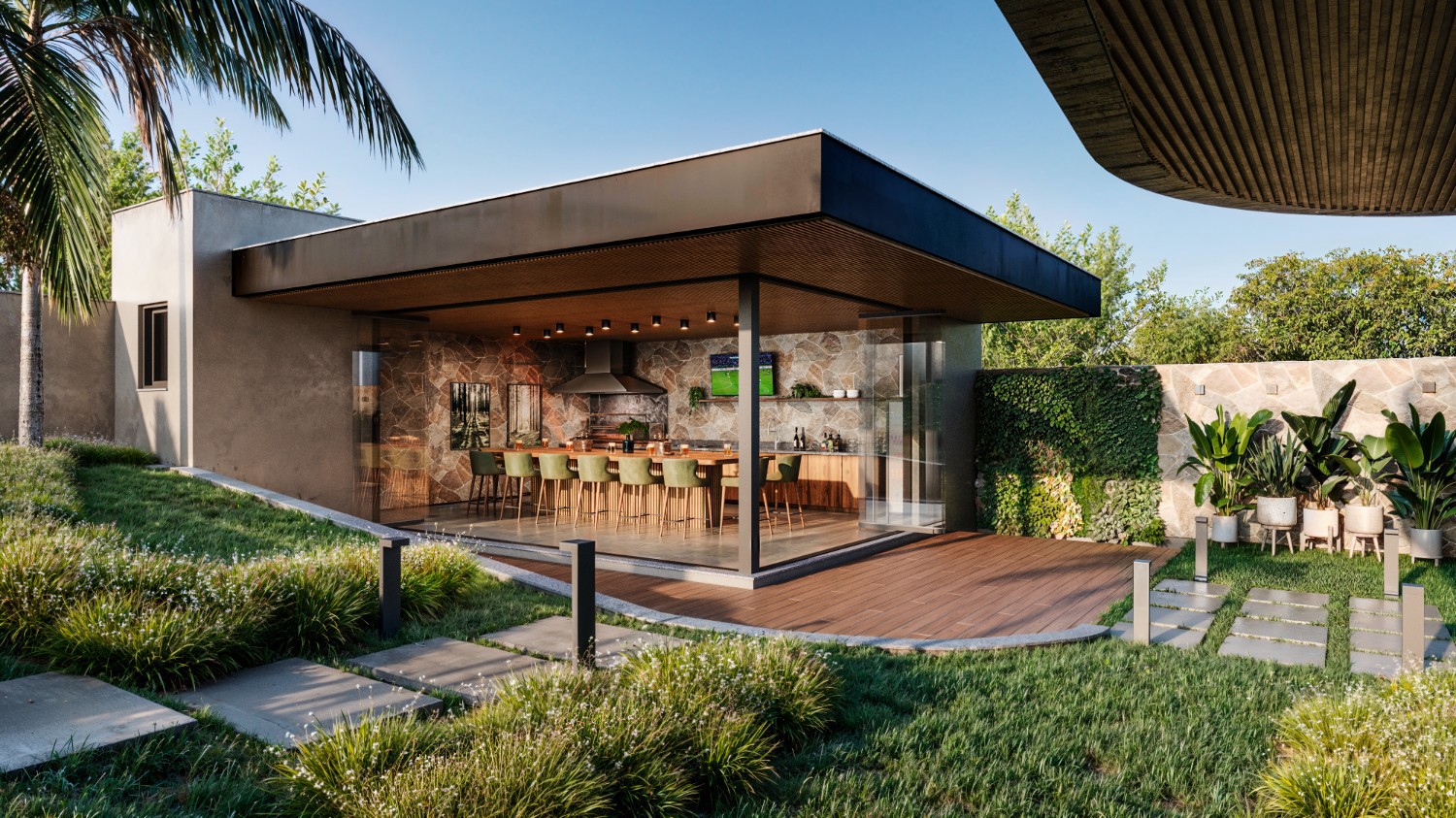 - Nos tetos das sacadas, o amadeirado ripado complementa esta estética;