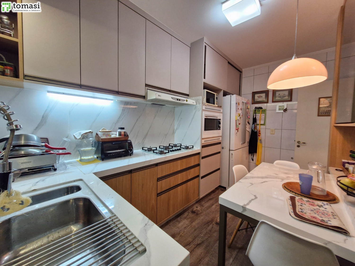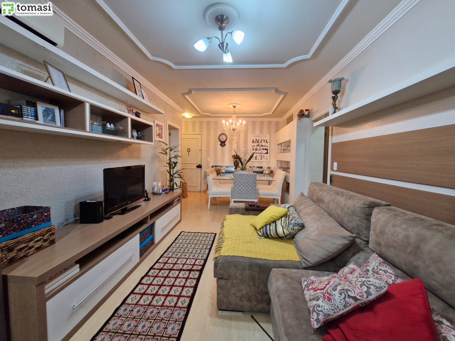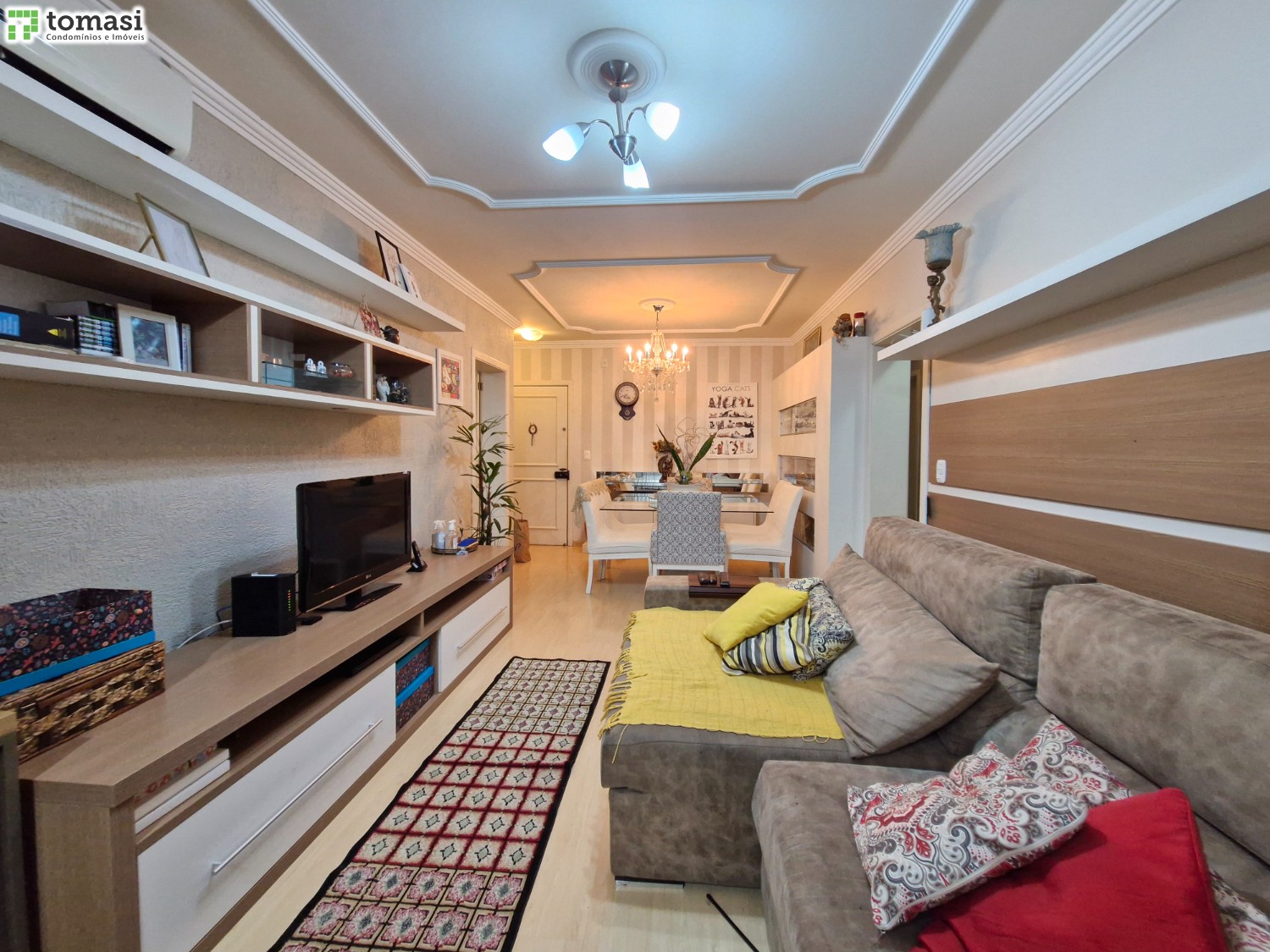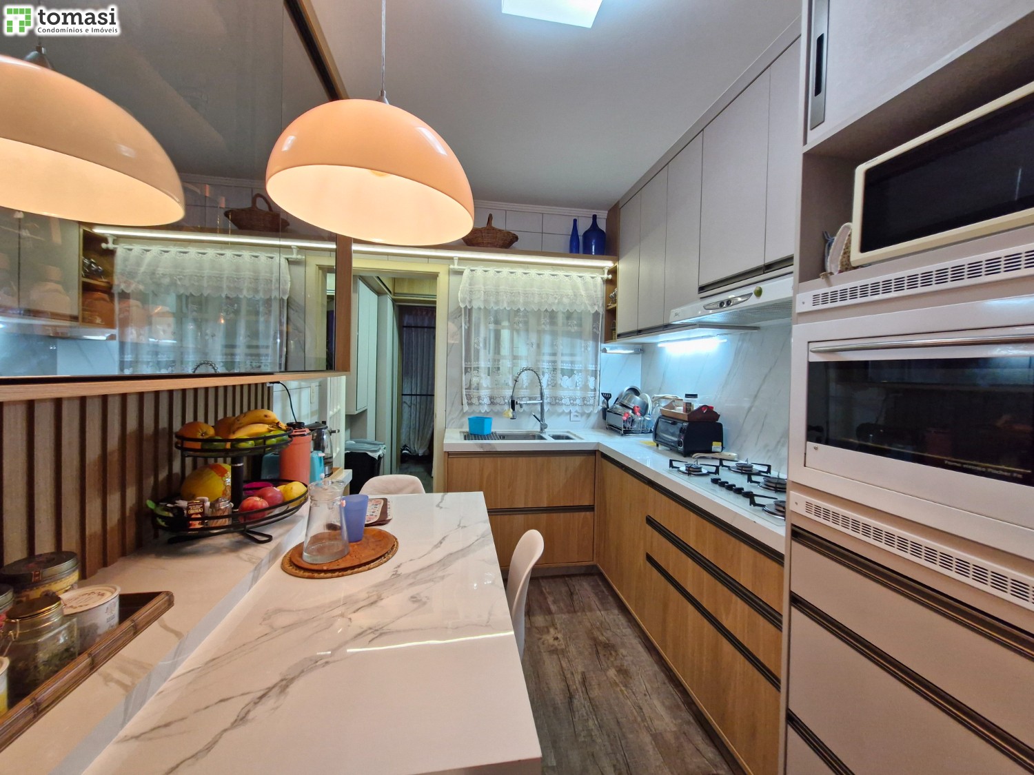 O apartamento possui 03 dormitórios sendo um deles suíte, sala de estar e jantar, cozinha, área de serviço, banheiro social e 02 boxes de garagem.
